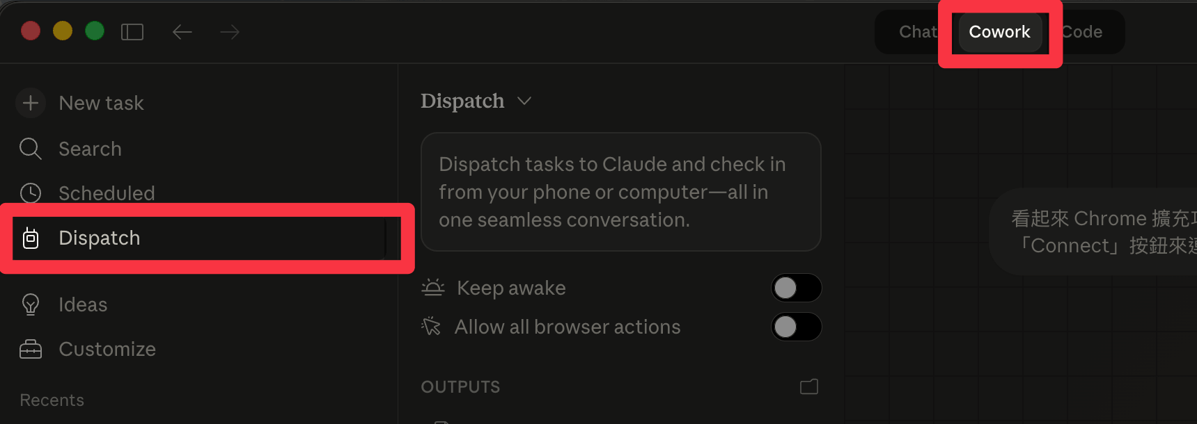 接下來打開 Claude Desktop,先切換到「Cowork」分頁,就可以在左側找到「Dispatch」