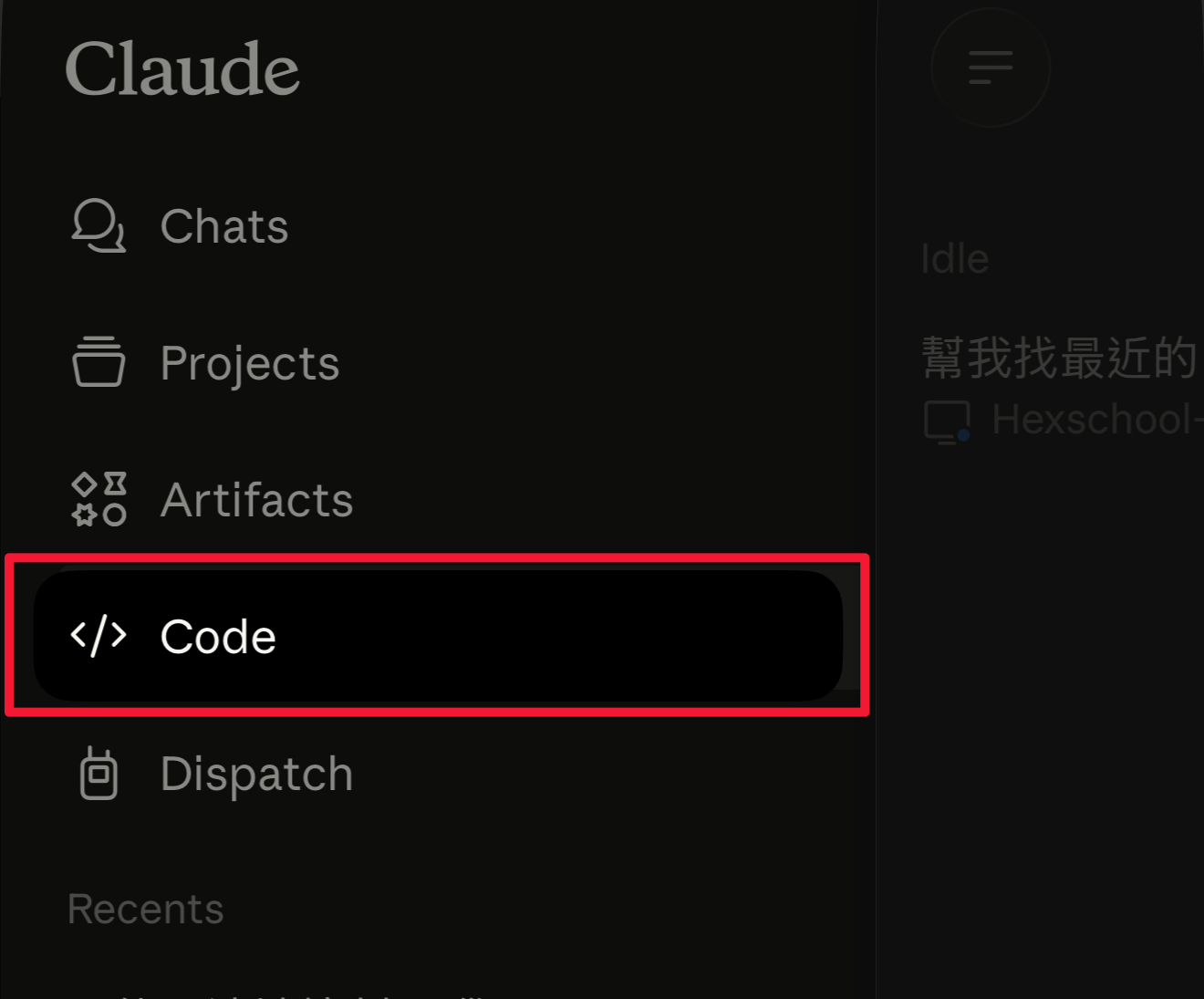 當然,如果你不喜歡網址方式,你也可以打開 Claude 的手機 APP 並再側邊欄找到 Code,就可以找到剛剛建立的 Session 了~